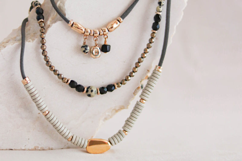 Piezas versátiles y con contraste de metales y acabados teniendo el jaspe dalmata y amatista como grandes protagonistas. Su color y reflejo a través de diseños contemporáneos invitan al mix & match. Descubre la perfecta combinacion entre si para un look de impacto.